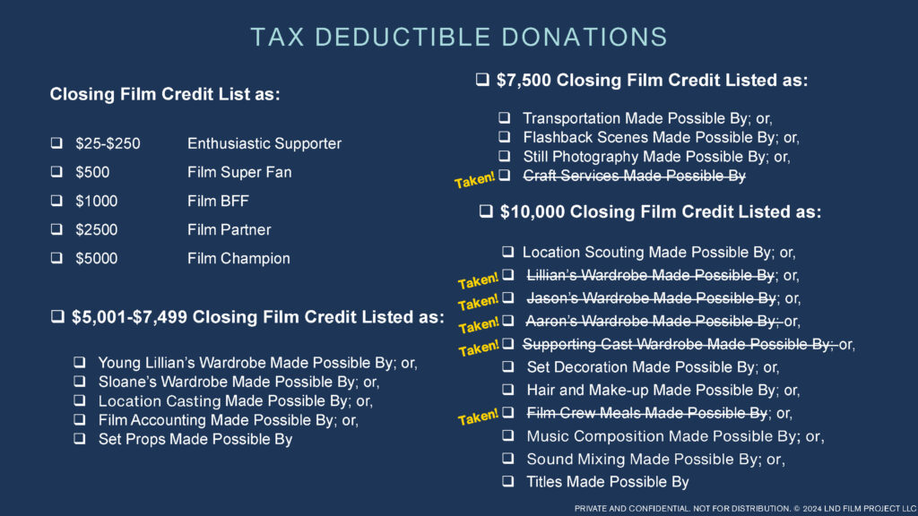 Your tax-deductible donation will help make this film, and you’ll be listed in the closing credits! Below is a summary of donation opportunities.